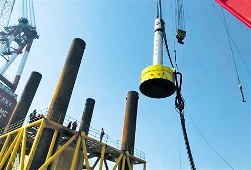 發(fā)展海上風(fēng)電,裝備必須先行。海上風(fēng)力發(fā)電機組安裝施工的關(guān)鍵環(huán)節(jié)是將近千噸的整體鋼管基礎(chǔ)樁植入到海床里。要做到這一點,必然需要大型打樁錘施工裝備。可是,作為目前海洋資源開發(fā)施工的主力裝備,全球海上作業(yè)液壓打樁錘長期被歐洲兩家公司壟斷,技術(shù)上受制于人不說,高昂的裝備價格還大幅抬升了風(fēng)力發(fā)電成本。