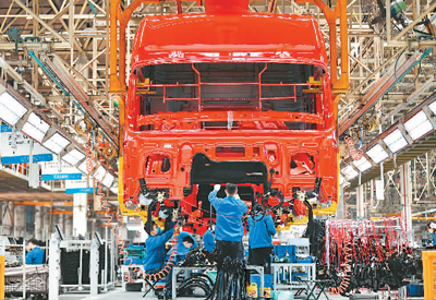 陜西汽車控股集團有限公司重卡總裝線現(xiàn)場。