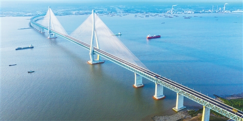 中國中鐵承建的滬蘇通長江公鐵大橋是中國自主設計建造、世界上首座跨度超千米的公鐵兩用斜拉橋(2020年6月29日攝,無人機照片)。