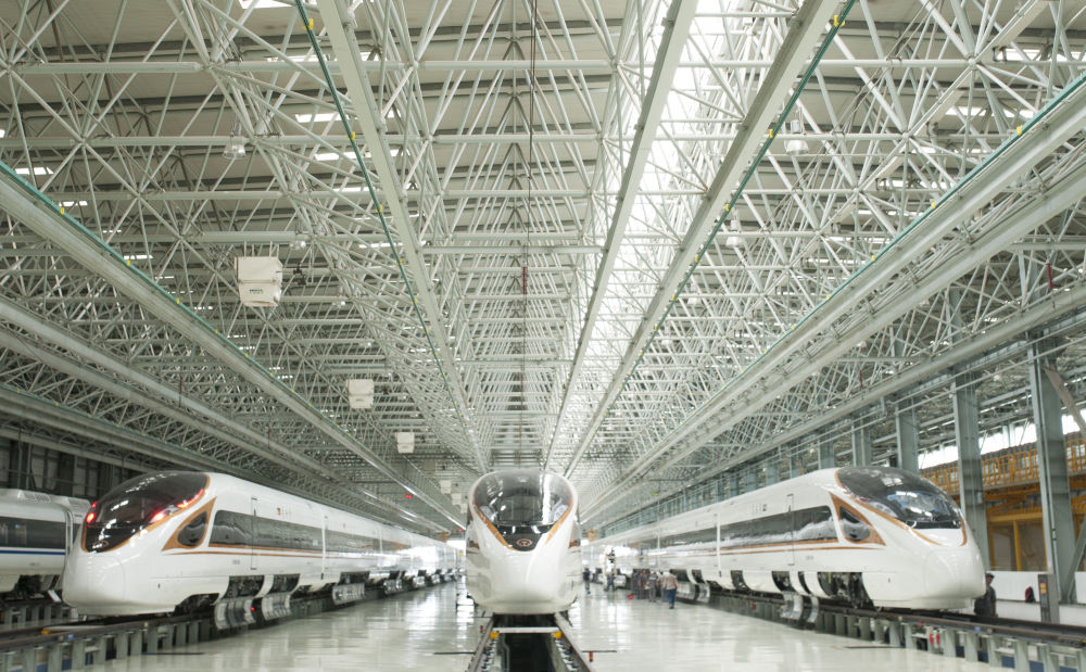 圖為中車長客高速動車組制造中心調試車間