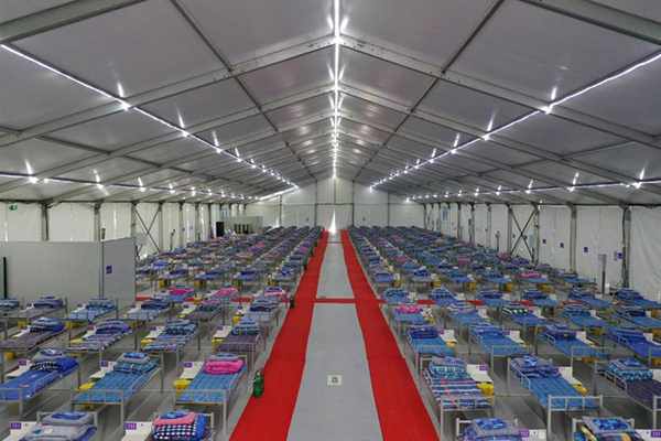 土方隊、土建隊、帳篷隊、機電隊、圍墻隊、排水隊……約3000名中國二十冶援建人員和近200臺入挖機、推土機、壓路機、汽車吊等大型機械設備組成了施工隊伍,完成了場地平整約10萬平方米、帳篷基礎澆筑約5萬平方米,混凝土澆筑量約2.7萬立方米、帳篷鋼結構和帳篷膜安裝18棟等。