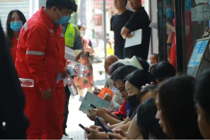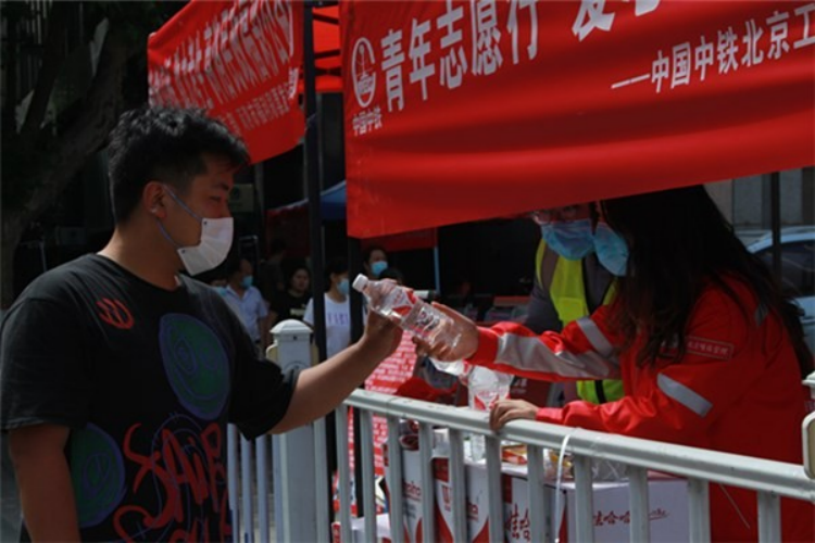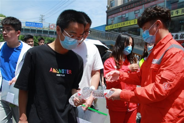 上午十時,考點外已經迎來了炎熱的太陽和聚集的家長人群,青年志愿者將一瓶瓶礦泉水遞給了他們,送上了最美好的祝福,同時也為陽光下執勤的公安、城管人員送來了物資和問候。突然,人群里一位六十多歲的老人出現了頭暈、出虛汗的中暑癥狀,青年團員們見狀馬上拿來了藿香正氣水等應急藥品,經過服藥安慰后,老人的癥狀得以了緩解。原來他是一位考生的爺爺,由于疫情原因孩子的父母都在外地上班回不來,焦急地等待和烈日照射讓老人出現了中暑的癥狀。