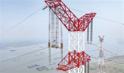國網安徽電力施工人員在200多米的高空,進行白鶴灘—江蘇工程的跨長江導線架設施工。