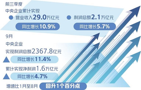 中央企業效益增速企穩回升。9月當月中央企業實現利潤總額2367.8億元,同比增長11.4%;累計實現凈利潤1.6萬億元,同比增長4.7%,增速比1月至8月回升1個百分點,9月當月實現凈利潤1805.4億元,同比增長13.8%,扭轉了7月、8月效益下行態勢。