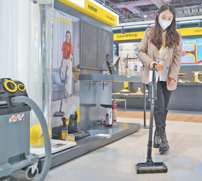 11月6日,在進博會消費品展區,展臺工作人員正在演示無線吸塵器。