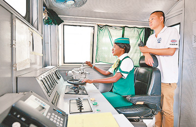 尼日利亞城鐵駕駛員在中國師傅指導下駕駛機車。(李涼 攝)