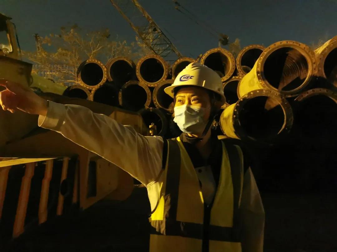深夜,燈火通明的孟加拉吉大港貨運碼頭,中交集團所屬中交天航局疏浚公司員工陳果的反光背心顯得格外明亮,這已經是她盯守碼頭現場的第11個夜晚。她一邊用自己總結的“孟式”英語和貨車司機交流著,一邊簽著排泥管線運輸單,嘈雜的機械聲和防疫社交距離讓她不得不提高音量。貨車司機們會意后,載著排泥管線前往薩布朗工區。