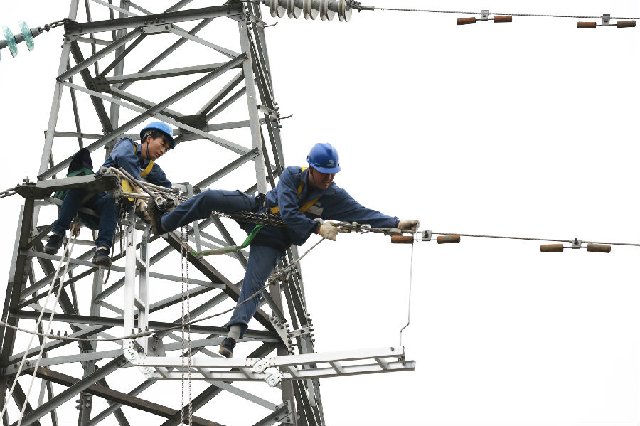 龍福剛使用自己改良過的安全工具器,在桿塔上開展輸電線路檢修維護工作。(盧關文 攝)