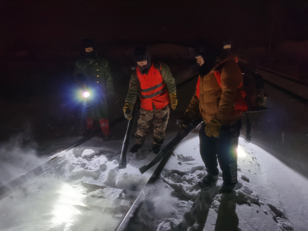 用鐵鍬鏟,用掃帚掃,再用吹風機吹……下午4點,天就黑了下來,隊員們分工協作,在手電筒微弱的光束下,頂著風雪艱難前行。兩個小時下來,5組道岔上的鋼軌清晰顯露出來。隊員們來不及停歇,又趕往下一個站點。