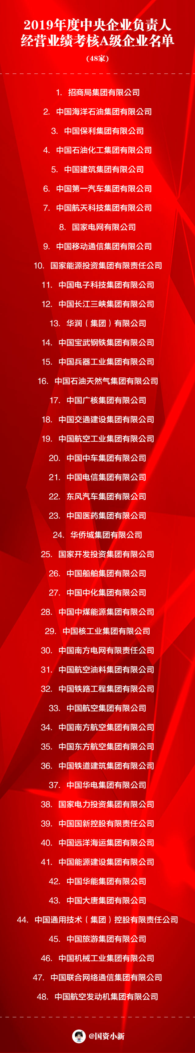 根據《中央企業負責人經營業績考核辦法》,2019年度中央企業負責人經營業績考核結果已經國資委黨委會議審議通過,現將A級企業名單通報如下: