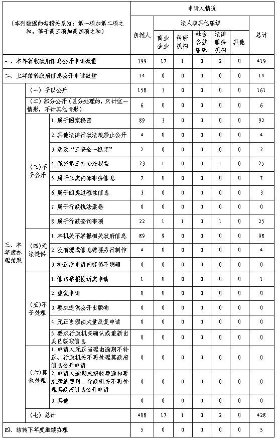 (二)依申請公開情況。全年共收到信息公開申請419件,上年度結轉14件,已按規定辦結428件,結轉下年度辦理5件。已辦結的申請中,予以公開161件、部分公開6件、不予公開158件、無法提供102件、不予處理1件;因信息公開被申請行政復議0件、提起行政訴訟3件。提起的行政訴訟,均為未經復議直接起訴件,其中結果維持2件,尚未審結1件。