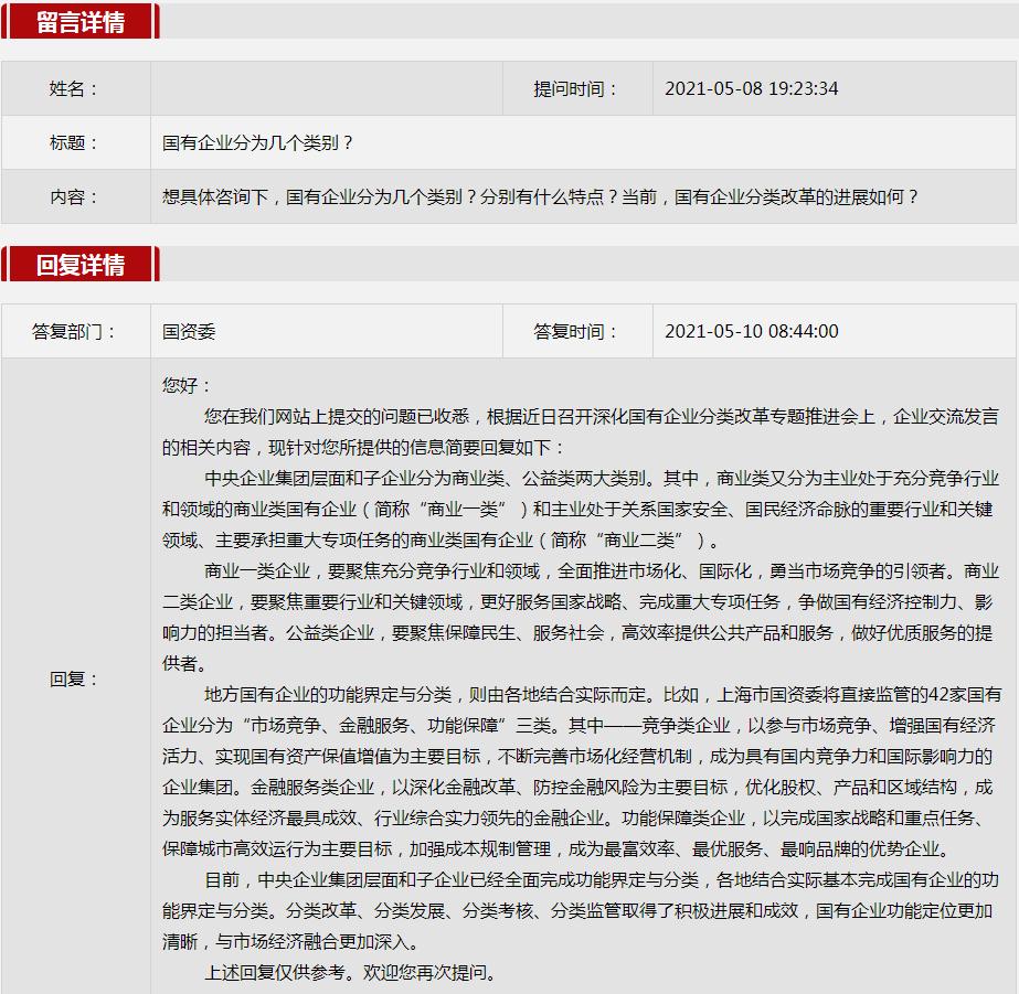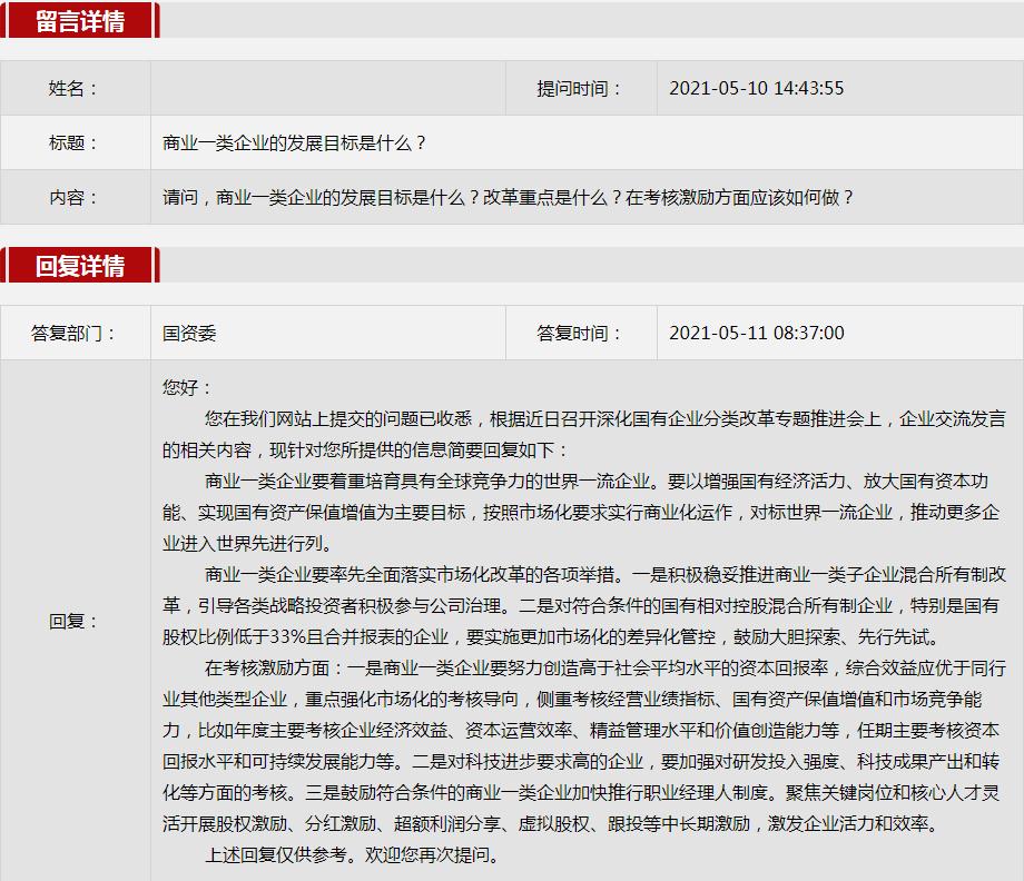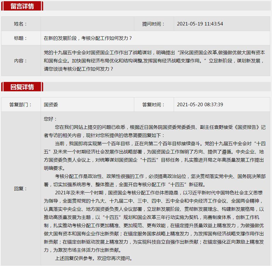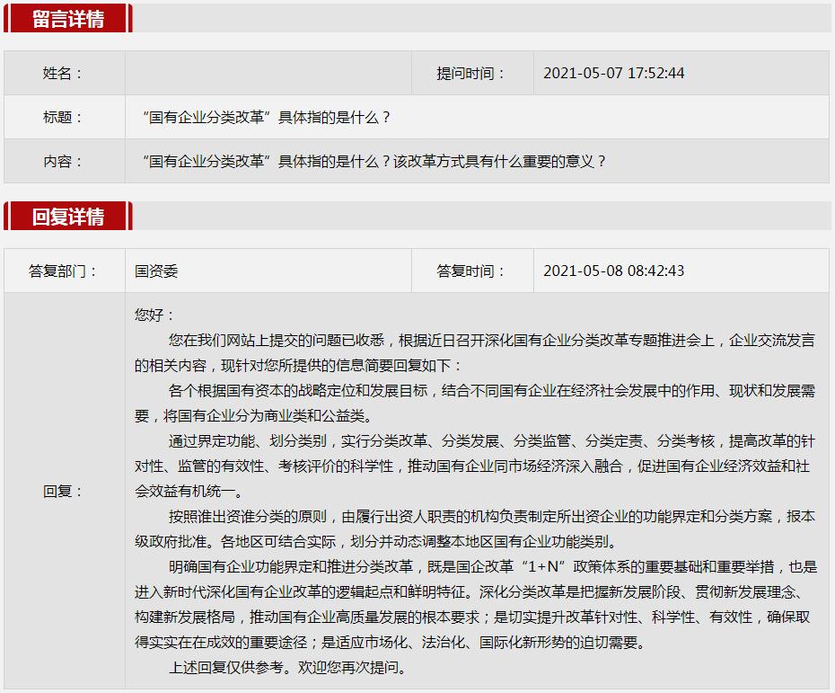 2021年5月國(guó)資委網(wǎng)站政務(wù)咨詢欄目部分網(wǎng)友提出的咨詢,我們初步做出了認(rèn)真的回應(yīng),現(xiàn)選擇五條關(guān)注度高、點(diǎn)擊量高的問題,再次推薦分享。