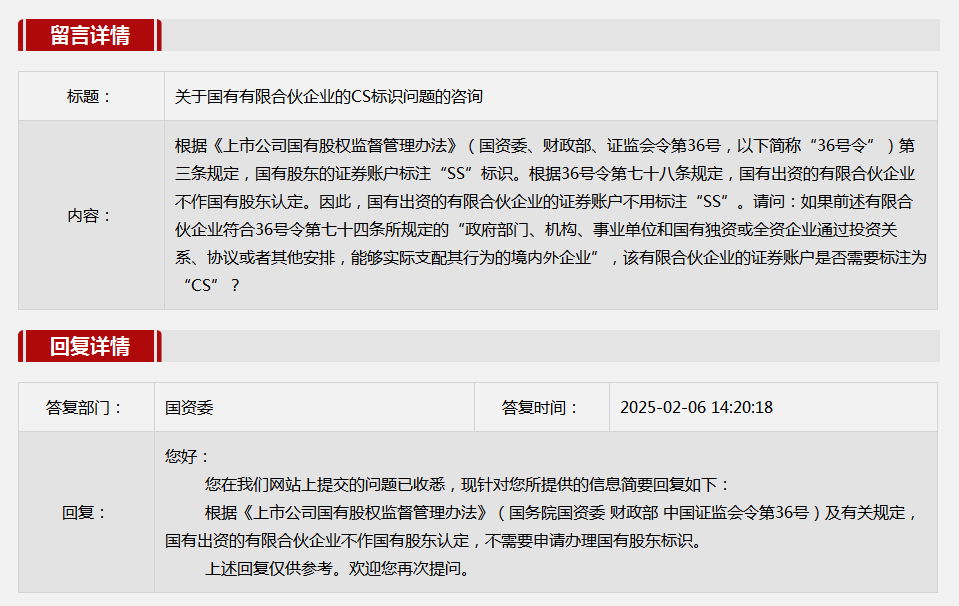 1.關于國有有限合伙企業的CS標識問題的咨詢