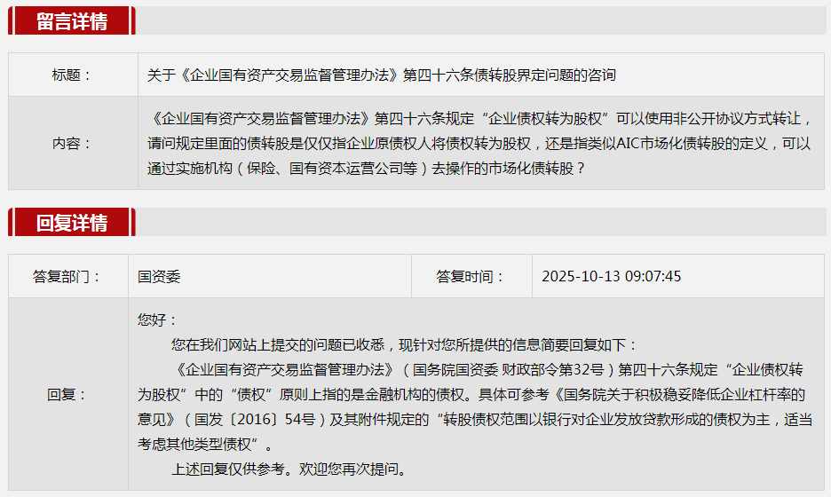 1.關(guān)于《企業(yè)國有資產(chǎn)交易監(jiān)督管理辦法》第四十六條債轉(zhuǎn)股界定問題的咨詢