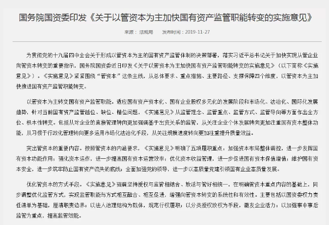 2019年11月7日,為貫徹落實黨的十九屆四中全會關于形成以管資本為主的國有資產監管體制的決策部署,按照黨中央、國務院關于深化國資國企改革的有關要求,國資委印發《關于以管資本為主加快國有資產監管職能轉變的實施意見》(簡稱《實施意見》)。11月27日,國務院國資委在京召開政策吹風會時表示,《實施意見》是國資監管機構第一次以文件的形式,明確管資本的具體路徑。國資委將以此次職能轉變為新起點,按照《實施意見》明確的方向和路徑,全面落實各項措施,著力完善以管資本為主的國有資產監管體制,不斷提高監管的系統性針對性有效性,確保管資本重點任務落實落地。