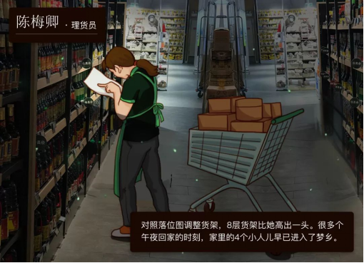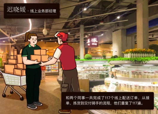 這天,她和另外兩個同事一共完成了117個線上配送訂單。這意味著從接單揀貨到交付騎手的流程,他們重復了117遍。一般情況下,這個流程被嚴格控制在15分鐘。