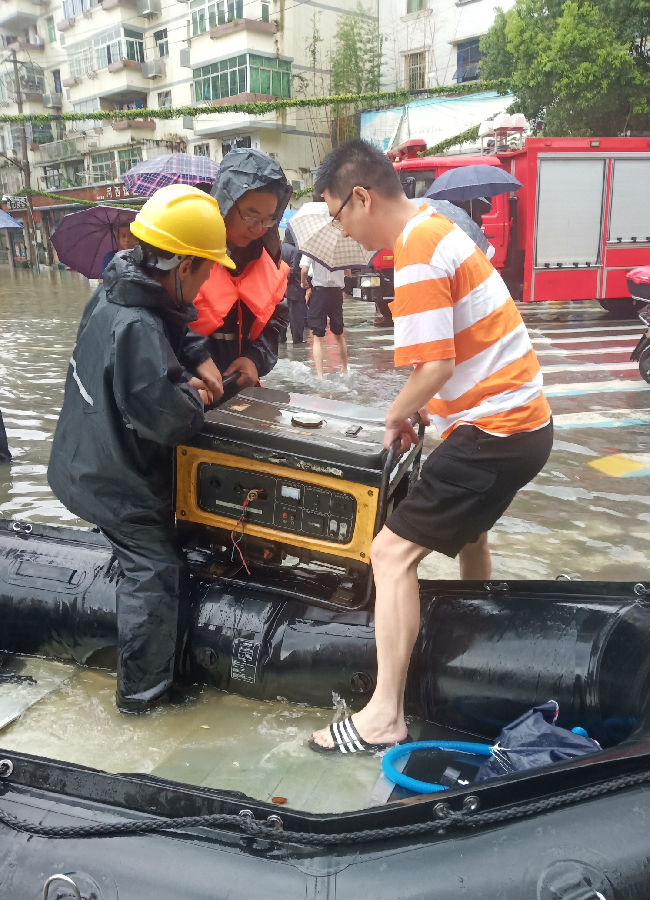7月10日,上饒市余干縣瑞洪鎮河街被淹,為了人民群眾用電安全,當地供電所拉閘停止供電。為保障周邊200戶居民通信信號暢通,中國移動員工蔡遠征、楚龍佩、蘇曉毅等人迅速組織搶修小分隊,不顧惡劣天氣,冒雨涉水撐船送油機到被淹的瑞洪3站發電。大家齊心協力抬著上百斤重的油機,涉水徒步趕往退服的基站。經過2個多小時的搶修,基站順利恢復運行。