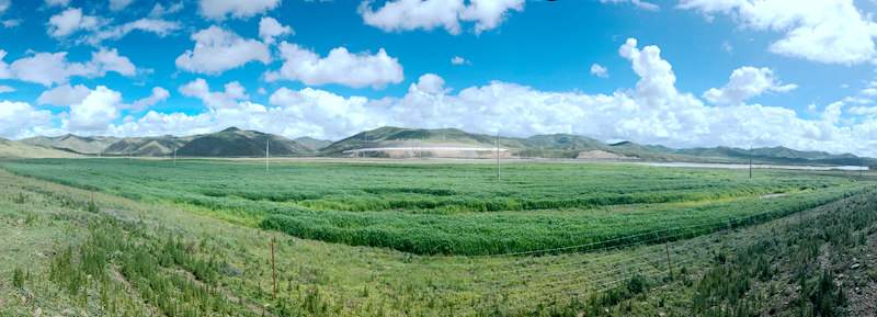 中國普天在吉邁鎮龍才村援建了近千畝飼草示范基地,成為該村集體經濟的支柱,將黑土荒灘改造為綠草場。圖為,扶貧干部楊柯磊組織發動牧民“以工代賑”收割飼草。