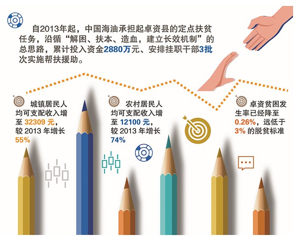 3月4日,經(jīng)內(nèi)蒙古自治區(qū)人民政府批準(zhǔn),中國海油對(duì)口幫扶地內(nèi)蒙古卓資縣正式退出貧困縣序列。至此,中國海油對(duì)口幫扶的6個(gè)縣市全部脫貧摘帽。