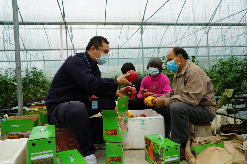 受疫情影響,扶貧彩椒滯銷,高鋒一邊幫村民收摘彩椒,一邊和村名一起想辦法解決難題。譚茂茜 攝