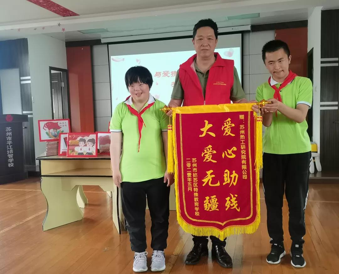 活動的最后,蘇州市姑蘇區特殊教育學校向蘇州院贈送“愛心助殘 大愛無疆”錦旗,以感謝他們對特殊兒童的關心和幫助。