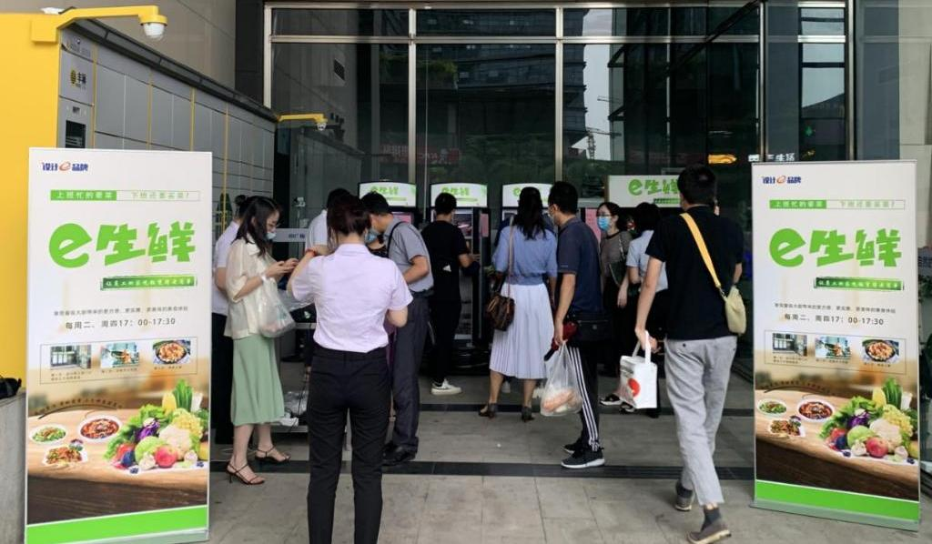 員工下班后紛紛到“生鮮e站”領取提前訂好的半成品菜