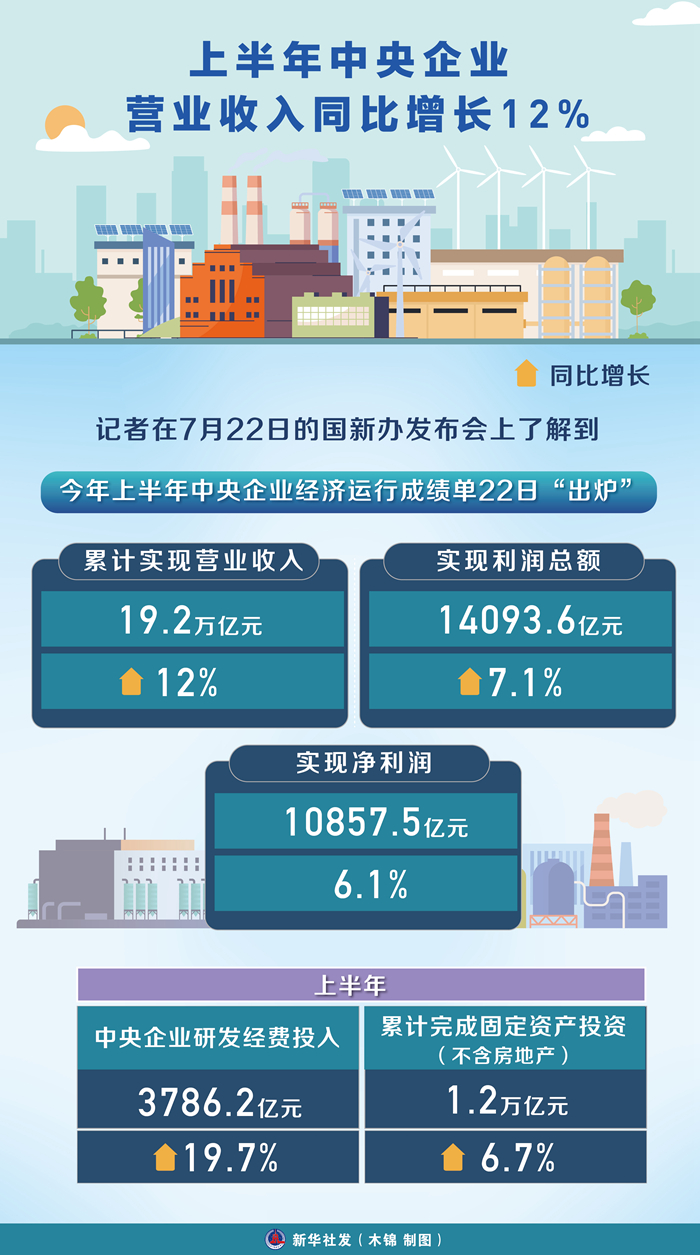 新華社北京7月22日電 今年上半年中央企業(yè)經(jīng)濟運行成績單22日“出爐”:累計實現(xiàn)營業(yè)收入19.2萬億元,同比增長12%;實現(xiàn)利潤總額14093.6億元,同比增長7.1%;實現(xiàn)凈利潤10857.5億元,同比增長6.1%。