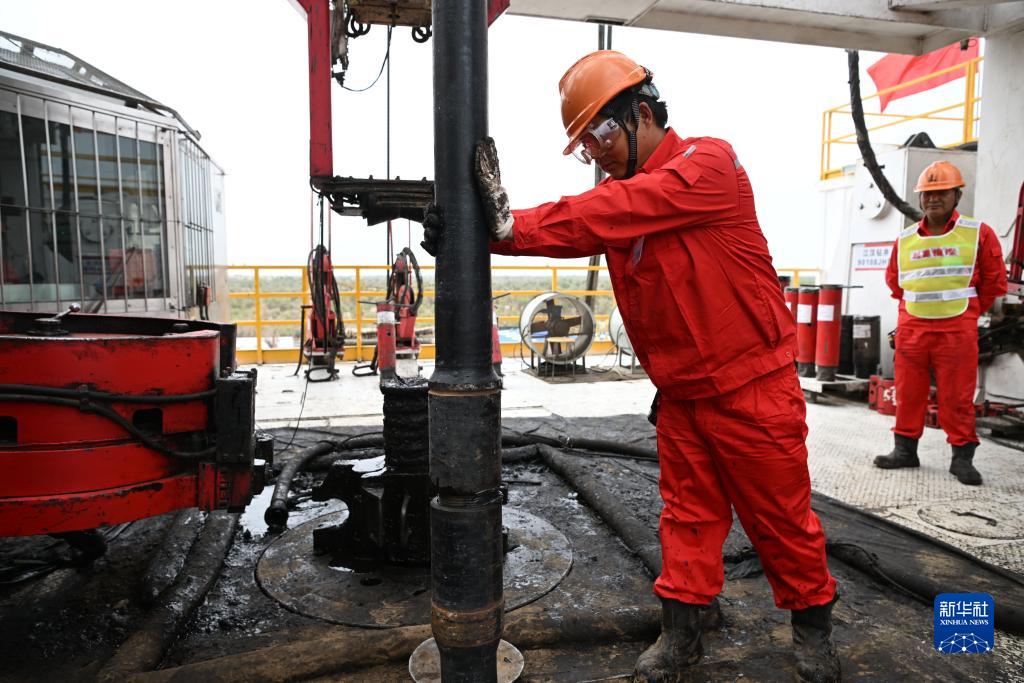 工作人員在中國石化塔里木盆地“深地工程”躍進3-3XC油氣井操作我國自主研發的超深井自動化鉆機進行鉆井作業(8月21日攝)。