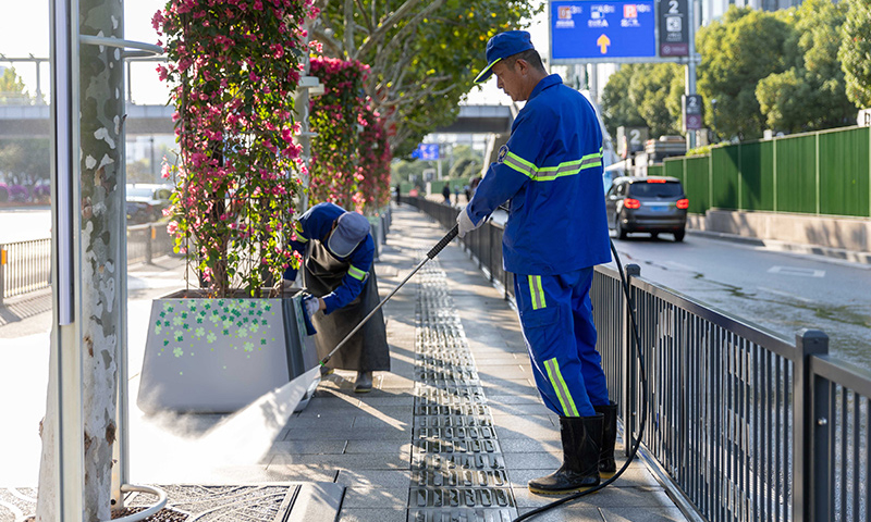 10月31日,環(huán)衛(wèi)工人在場館周邊進行清潔工作。新華社記者 王翔 攝