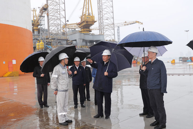 2018年6月13日,習近平來到中集來福士海洋工程有限公司煙臺基地。作為國內率先進入海洋工程行業的企業,中集來福士用10年左右時間,國產化率從不足10%提高到60%。在廠區碼頭上,習近平撐著雨傘,趟著積水,近距離察看??吭谶@里的自升式修井生活平臺,遠眺“藍鯨1號”超深水雙鉆塔半潛式鉆井平臺、“泰山”龍門吊、海洋牧場平臺,向企業負責人詳細了解高端海洋工程設備制造、維護、運行情況。海風吹起了衣襟,雨水打濕了褲腿。習近平站在雨中,同圍攏過來的工人們一一握手、親切交談,向作業平臺上的工人們揮手致意。習近平指出,國有企業特別是中央所屬國有企業,一定要加強自主創新能力,研發和掌握更多的國之重器。國有企業要深化改革創新,努力建成現代企業。要堅持黨對國有企業的領導不動搖,堅持建強國有企業基層黨組織不放松,為做強做優做大國有企業提供堅強組織保證。