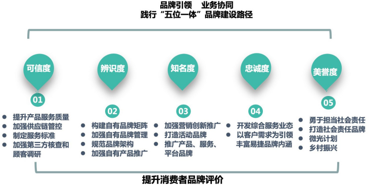 “易捷”根據(jù)零售業(yè)和服務(wù)業(yè)的行業(yè)特點(diǎn),進(jìn)一步把“客戶評(píng)價(jià)”細(xì)分為“可信度、辨識(shí)度、忠誠(chéng)度、知名度、美譽(yù)度”五個(gè)維度,確定了“五位一體”全面推進(jìn)的品牌建設(shè)路徑。