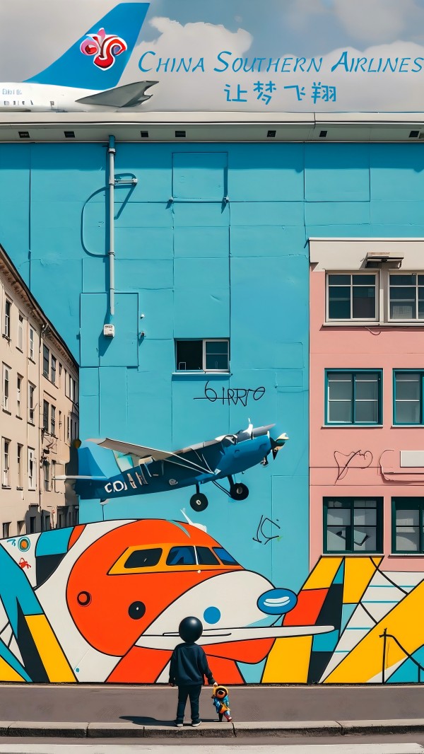 這幅作品展示了一個(gè)充滿童真與夢(mèng)想的場景,畫面中一個(gè)小男孩帶著飛行員頭盔,手握玩具,站在涂鴉墻前,仿佛在暢想著自己的飛行員之夢(mèng)。墻上精美的涂鴉繪畫描繪了兩架飛機(jī):上方是一架藍(lán)色的上單翼飛機(jī),象征著飛行員初期的訓(xùn)練飛機(jī);下方是一架色彩鮮艷的民航客機(jī),象征著飛行員的職業(yè)目標(biāo)。天空中如夢(mèng)一般的南航客機(jī)尾翼則展示了南航品牌文化元素。