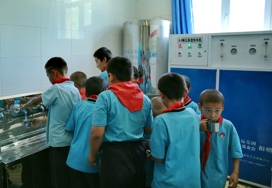2016年以來,中遠海運聯合新疆資助教育基金會,在新疆喀什、吐魯番等地學校添置凈化飲水機、乒乓球臺、籃球架等設施。圖為凈化飲水及體育設施投入前后對比。