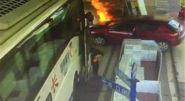 6月16日11時22秒,位于湖南長沙岳麓區(qū)的中石油岳麓大道加油站發(fā)生一起交通事故,一輛紅色雪鐵龍因突發(fā)故障無法剎車,快速撞上該加油站4號機位。由于撞擊力過大,4號加油機當場起火。事發(fā)時正是加油高峰時段,在事發(fā)處約1米遠,有一輛剛加完油的大巴車,車載47名乘客,現場還有30余輛小車。好在工作人員反應及時,38秒化解了危機,未造成人員傷亡。