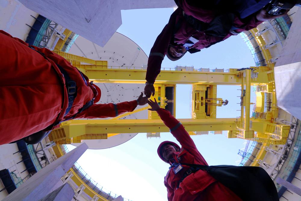 2018年3月21日,我國自主知識產權的第三代核電-“華龍一號”示范工程第二臺機組進行穹頂吊裝。在穹頂起吊那一刻,參與吊裝的工程師們留下了這張合影,然后奔赴各自的工作崗位。