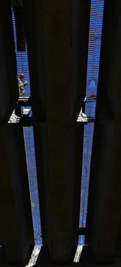 作品說明:2016年9月6日,青海民和至小峽公路物流園特大橋正在進行橋面系施工。從橋下望去,一個工人正好在兩片橋梁的縫隙處作業,小小的身軀猶如一個動人的音符點綴在曲譜上。