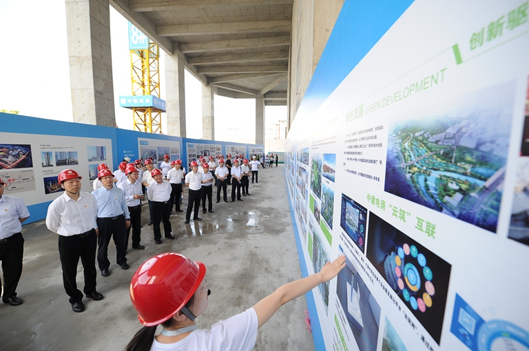 在中建六局中建中心項(xiàng)目活動(dòng)現(xiàn)場(chǎng),與會(huì)人員參觀中國(guó)建筑品牌展